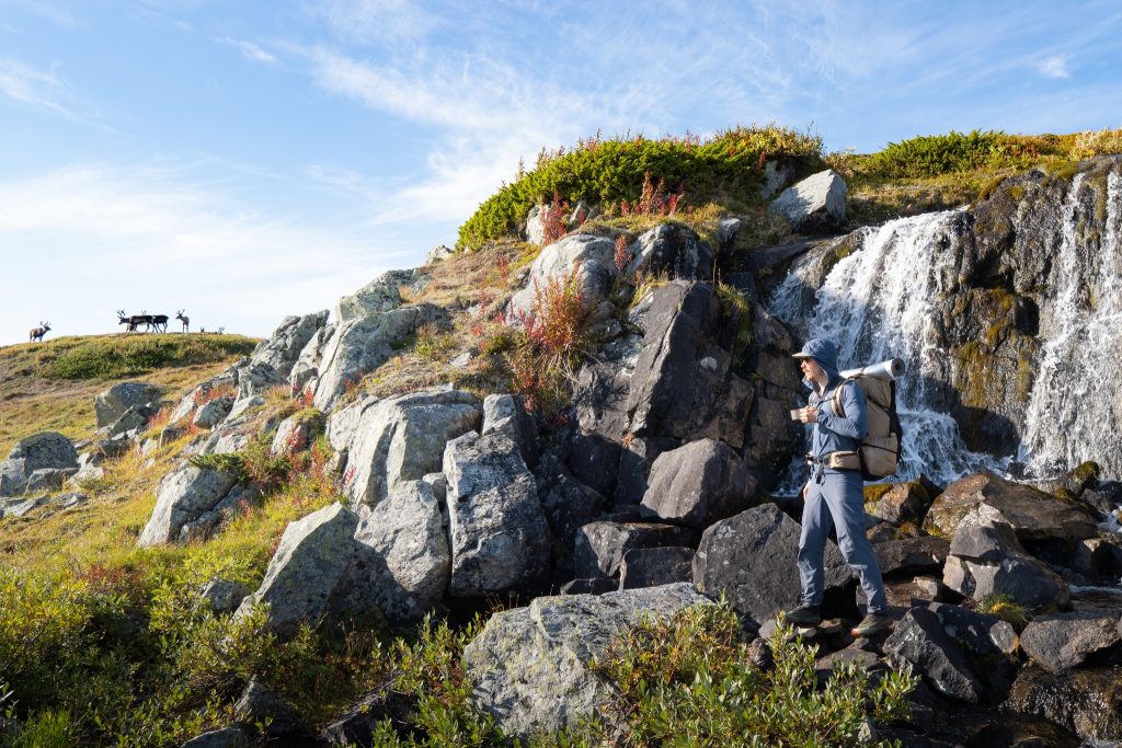 Löysimme tällä kertaa onneksi paremman reitin pajukon läpi. Korkeaa varvikkoa kuitenkin jatkui korkealle tunturiin, eikä se oikein tuntunut loppuvan. Vasta korkealla ylängöllä pusikot kaikkosivat tasaisen paljakan tieltä. Joimme keskellä aukeaa paljakkaa solisevasta vesiputouksesta, jonka yläpuolella porot kurkkivat uteliaina touhuamme.