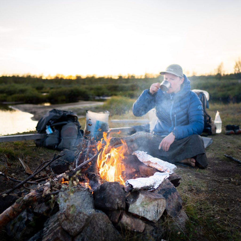 Kävelimme pitkän matkan takaisin leiriin, jossa paistoimme kaksi kaloista ja graavasimme yhden. Hautasimme folioon pakatun graavikalan kylmään kosteaan rantahiekkaan. Nautimme auringonlaskusta ja mainiosta vuodenajasta täysin hyttysettömässä ilta-auringossa. Kokeilimme testimielessä tehdä pienen nuotion maasta löytyvästä vaivaiskoivun risusilpusta, joka onnistuikin yllättävän hyvin. Ainakin pienet tulet on mahdollista tehdä myös kuivasta vaivaiskoivusilpusta, vaikka avotunturista ei muuta löytäisikään.