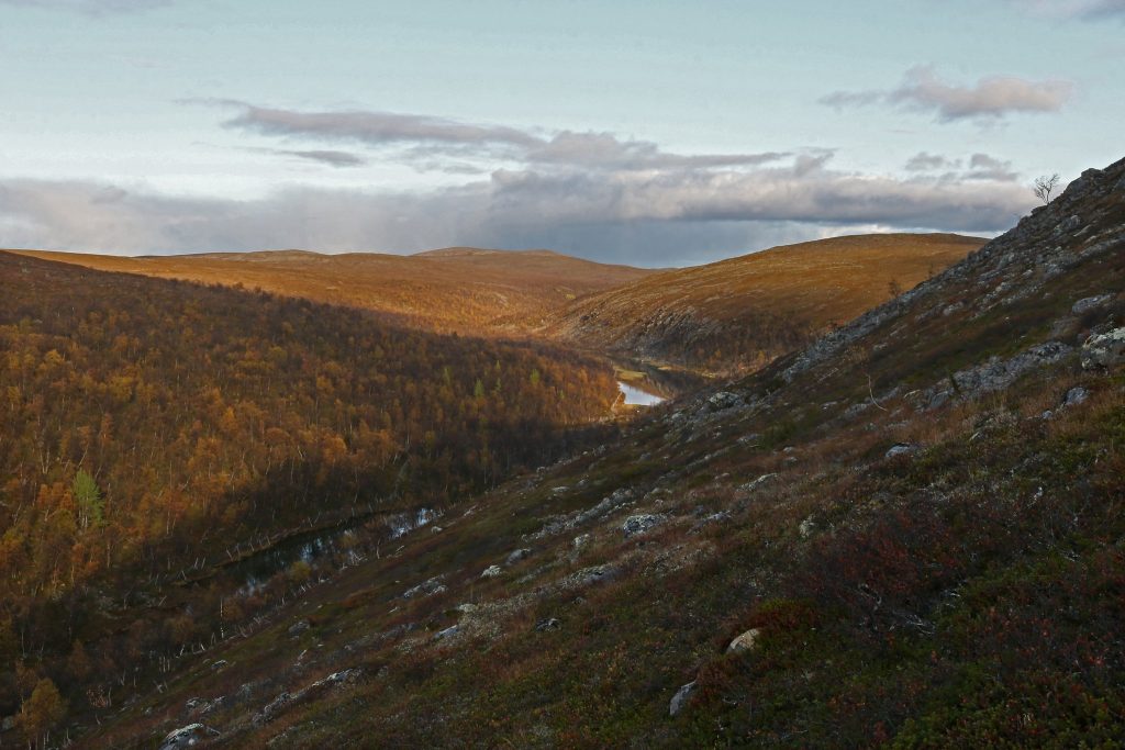 Tupa onkin kuulemma alun perin rakennettu järven rantaan, mutta koska sitä käytetään myös talvisaikaan, on se lumivyöryvaaran takia jouduttu siirtämään kanjonista turvallisemmalle paikalle. Kanjoni onkin melko voimakas ilmestys. Tutustumme siihen iltaretkellä sen eteläpuoliselta Uhca Avžegašoaivin rinteiltä. Viimeiset auringonsäteet pääsevät juuri kultaaman kanjonin pohjan, kun pääsemme ylös aiville.