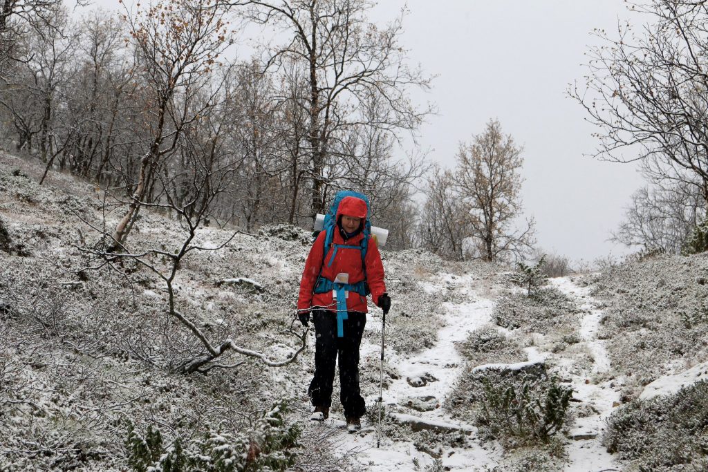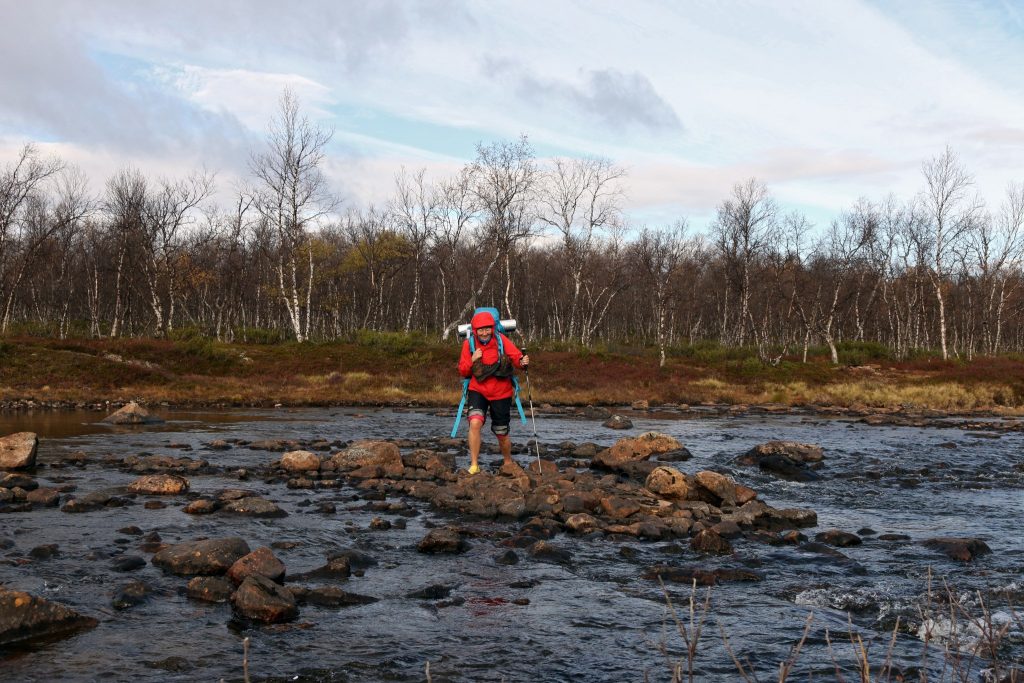 Syyskuisen ensilumen vaippa on kuitenkin hento, ja jo aamupäivän aikana auringon säteet sulattavat sen etelärinteiltä. Iltapäivään mennessä värit ovat palanneet ruutuun. Kylmyys pitää kuitenkin mielen raikkaana, kun kahlaamme Karigasjoen poikki. Kuivan kesän jäljiltä vettä on vain polviin saakka, mutta uoma on viitisen metriä leveä. Joelta matka jatkuu ylös tunturiin vielä muutaman kilometrin polkua pitkin, kunnes ura pikkuhiljaa katoaa. Sen jälkeen saamme itse valita tiemme.