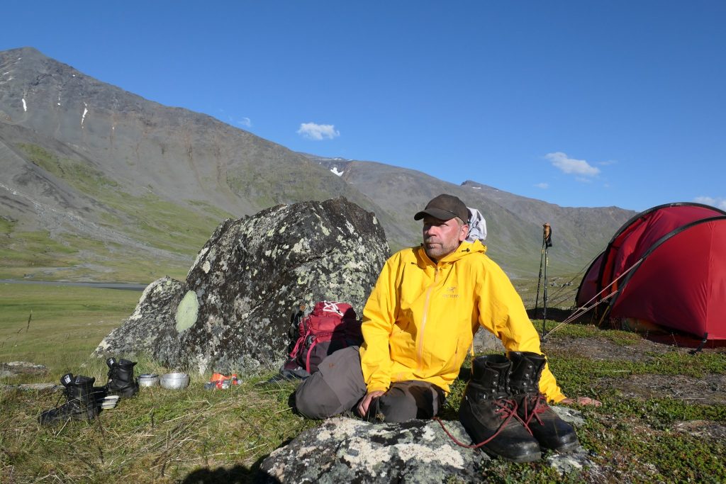 Jokivartta seurasi pieni polku, joten matkanteko oli helppoa ja joutuisaa. Aurinko helotti kumpupilvien lomasta. Suoraan edessä häämötti Niják, Sarekin tunturimassiivin pohjoisin huippu. Jokilaakson toisella puolella kohosi puolestaan Akkatunturin massiivinen seinämä. Hyvä sää siivitti meidät alkuperäisiä suunnitelmia pidemmälle pieneltä Gisurisjäätiköltä purkautuvan puron varteen erinomaiselle leiripaikalle. Juomavedet haimme hiukan kauempaa kirkasvetisestä pikkupurosta. Teltan pystytys, pieni levähdyshetki ja ruuan kokkailua – leirielämä maistui hyvältä, etenkin sää oli vaeltamisen kannalta ihanteellinen.