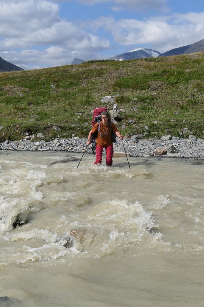 Pian edessä oli vaelluksen ensimmäinen vaativampi kahlaus. Ruohtesin jäätiköiltä laskeutuva Smájllájåhkå on leveä palmikoiva uoma. Katselimme ylityspaikkaa jo kaukaa, sillä sinne näytti kerääntyneen jonkin verran väkeä. Päätimme suunnata pois polulta muiden käyttämään ylityspaikkaan vaihtaaksemme tuoreita kokemuksia kahlauspaikasta. Pohjaa ei siltin värjäämän veden läpi nähnyt, mutta kuulimme joen olevan varsin kohtuullinen ylitettävä – pohja oli helppokuluista soraa ja vesi ylettyisi ainoastaan polveen saakka. Vaikka joella oli leveyttä, ei voimakaskaan virtaus matalassa vedessä tuottanut vaikeuksia.