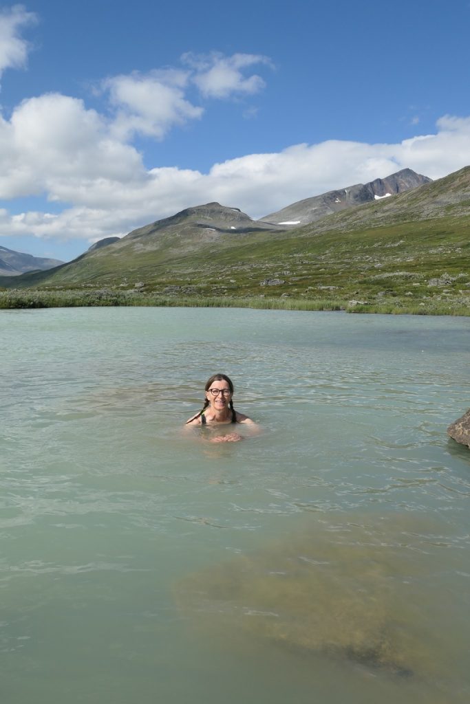 Edessä oli vielä Bielajärvelta laskeutuva Bielajåhkå, joka osoittautui ennakkotiedoista poiketen helpoksi kahlattavaksi. Joessa on useita pieniä altaita, ja kun vesi jokea ylittäessä tuntui erityisen lämpimältä, päätimme pulahtaa joen raikkaisiin vesiin. Jännittävän päivän päätteeksi edessä oli vielä sopivan leiripaikan etsiminen. Olimme jo päättäneet pystyttää leirimme Bielavárásjin kupeeseen, mikäli paikalta löytyisi virtaavaa purovettä. Sitä löytyi ja saimme pystyttää telttamme epäilemättä yhdelle komeimmista leiripaikoista, missä koskaan olen päässyt yöpymään. Maisemat avautuivat kolmeen eri ilmansuuntaan: Rapajoen laaksoon, Biela- ja Bierikjärville sekä Ähparin ja Bårdden tunturimassiiveille.