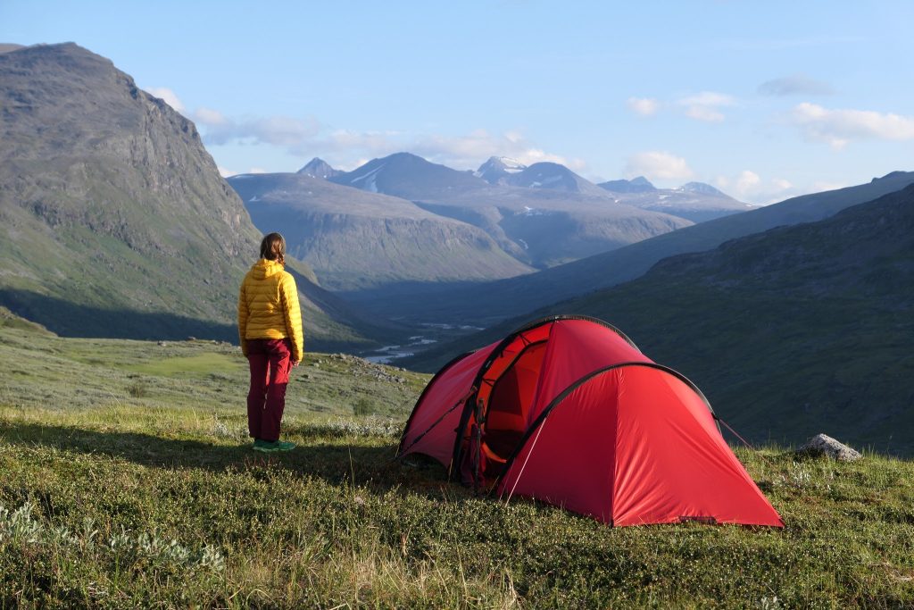 Nousu takaisin tunturiylängölle oli pitkä ja jyrkkä. Matkantekoa helpotti pieni mutta selvä polku, jota jatkui reilusti puurajaan saakka. Tämän jälkeen olimme jälleen poluttomalla taipaleella. Olimme päättäneet jatkaa jyrkkien rinteiden välisessä rotkossa virtaavan Lulep Vássjágåsjin yli johonkin sopivaan leiripaikkaan Rådnikin tunturin kupeeseen. Leiripaikka löytyikin pienestä satulasta tunturin sivuharjanteelta. Sää oli poutainen, mutta korkeimmat huiput peittyivät pilveen. Emme olleet nähneet päivän aikana ketään, mutta leirin pystytettyämme meidät ohitti yksinäinen kulkija.