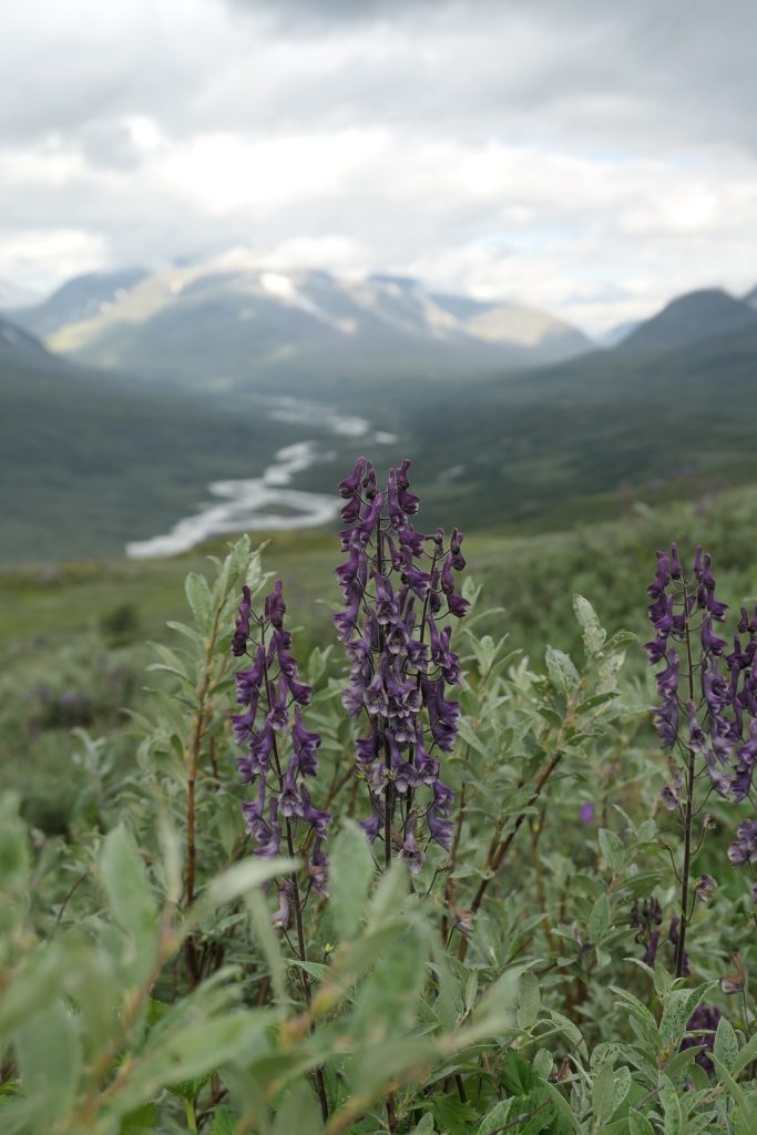 Jatkoimme toisena päivänä merkittyä Padjelantaledeniä pitkin samannimisessä kansallispuistossa. Pääosa reitistä kulki harvoissa tunturikoivikoissa, joskin välillä ylitimme muutamia soita ja paljaita tunturinummia. Paikoitellen polunvarsi oli täynnä vielä valtoimenaan kukkivaa kultapiiskua, toisaalla kukkimistaan olivat lopettelemassa näyttävät kaarlenvaltikat. Oikoreitti Sjnjuvtjudiksen ja Akkatunturin välistä ei houkuttanut, sillä emme halunneet reitillemme yhtään ylimääräistä ja potentiaalisia riskejä aiheuttavaa kahlausta – niitä oli muutenkin reitillä riittämiin.