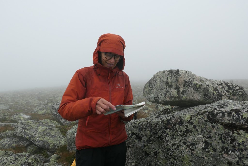 Seuraava aamu valkeni sumuisena. Näkyvyys vaihteli päivän mittaan muutamasta sadasta metristä täyteen hernerokkaan, mikä vaikeutti suunnistamista. Kuljimme tunturiylängöllä korkeuskäyriä myötäillen itään ja ylitimme jyrkässä rotkossa virranneen Buovdajågåsjin. Ylityspaikkaa joutui hiukan hakemaan, sillä jyrkän laakson pohjalle ei pystynyt laskeutumaan joka paikasta. Toinen kahlaus tuli vastaan Nammásjåhkån latvoilla, josta nousimme Gierdogiesjtjåhkkån tunturin eteläiselle harjanteelle. Sumu alkoi tiivistyä niin sakeaksi, että mietimme aikamme jatkamisen mielekkyyttä. Sijainti oli kuitenkin edelleen tarkkaan selvillä, vaikka hetken kyllä kirosinkin GPS-laitteen kotiin jättämistä. Tämä oli kuljetulla reitillä ainoa paikka, jossa siitä olisi ollut todellista hyötyä. Kovin paljon harhaan reitillä ei voisi kulkea, kunhan suunta pysyisi kompassin avulla oikeana.