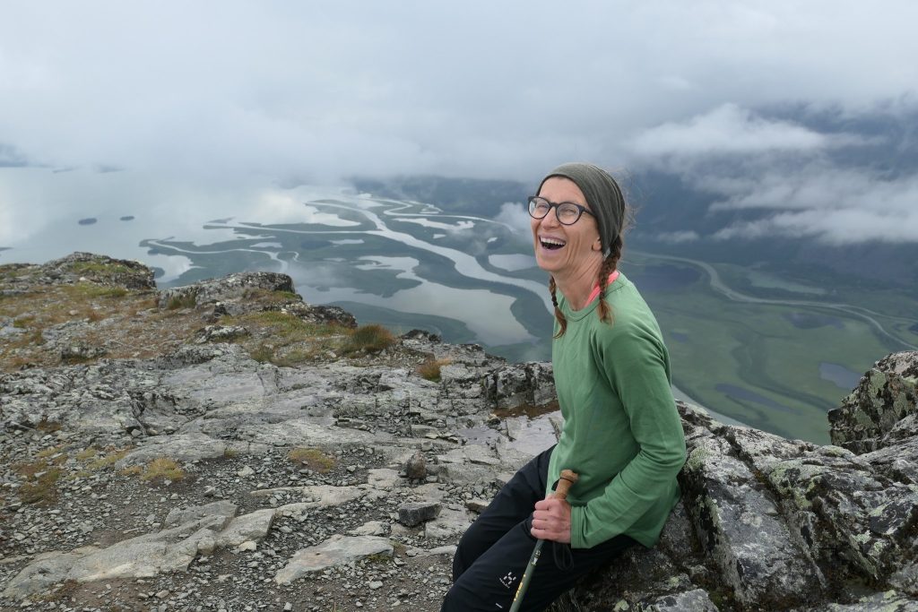 Nousimme vielä hiukan ylemmäs turvallisen etäisyyden päästä jyrkänteestä, kunnes saavutimme alun perin tavoitteenamme olleen polun. Sumu alkoi hiukan hellittää ja nakkasimme rinkkamme polun varteen kiivetäksemme loppumatkan jyrkänteen reunan ikoniselle näköalapaikalle. Näkymät olisivat olleet kirkkaammalla säällä varmasti paljon hienommat, mutta olimme tyytyväisiä – vaellus oli saavuttanut loppuhuipentumansa ja edessä oli helppokulkuinen osuus paljon tallattua Kungsledeniä pitkin Saltoluoktaan. Sivupolku Skierffelle kuuluu monen Kungsledenin kulkijan ohjelmaan, joten muita vaeltajia alkoi tulla vastaan tasaiseen tahtiin. Erämaa oli jäämässä taakse.